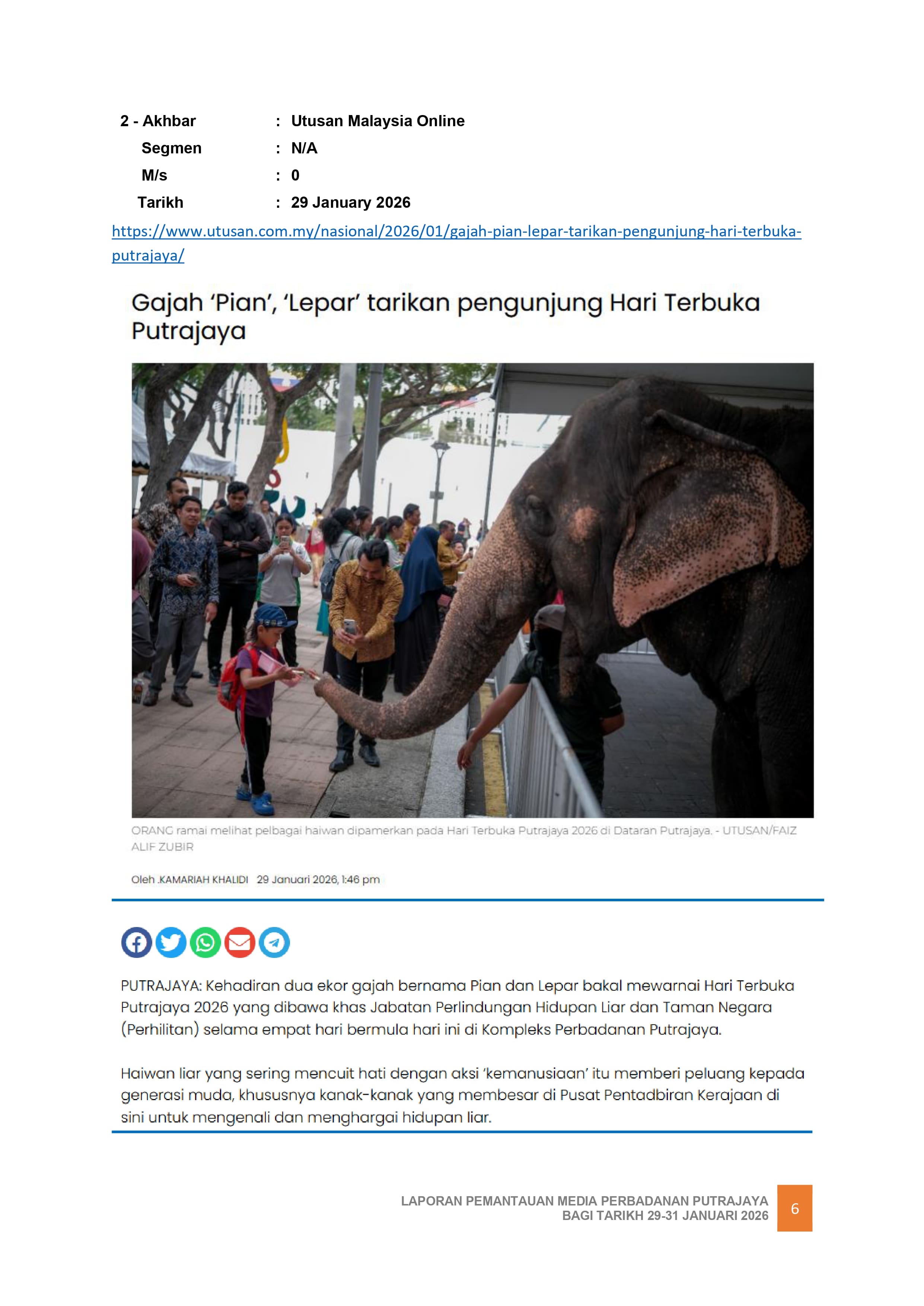 GAJAH 'PIAN', 'LEPAR' TARIKAN PENGUNJUNG HARI TERBUKA PUTRAJAYA