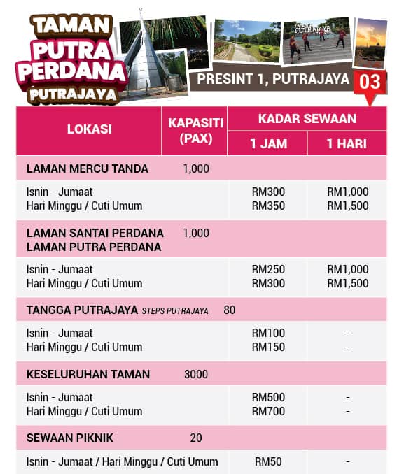 Untuk mengetahui kadar sewaan atau tempahan. Klik di sini untuk maklumat kadar sewaan tapak dan tempahan